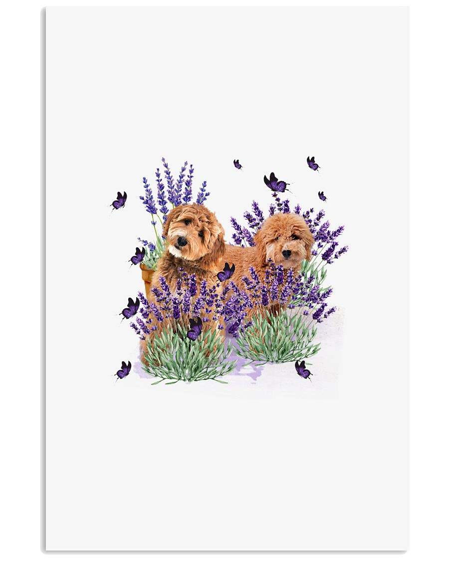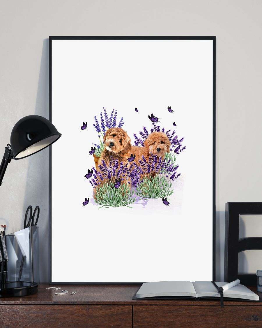 Goldendoodle with lavender flower poster