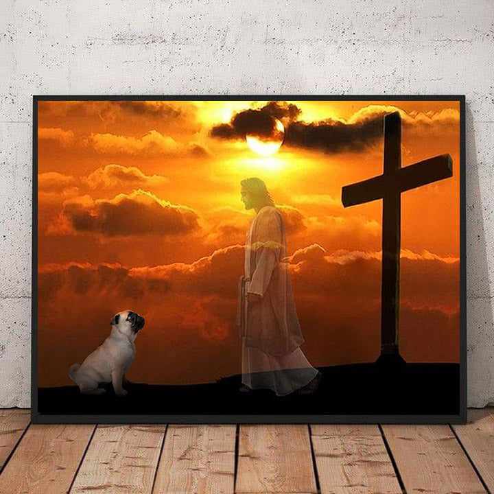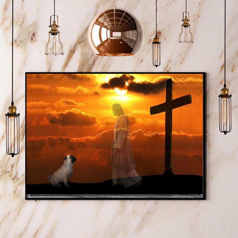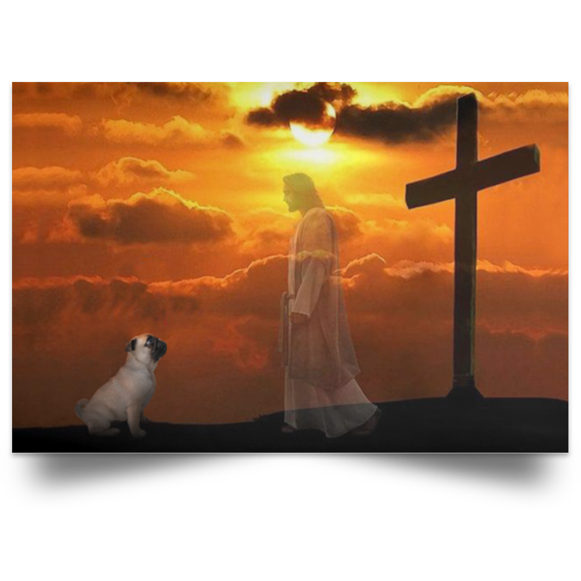 Pug Jesus Christ Poster Cross Sunset View Wall Art Decor Housewarming Gift For Christian