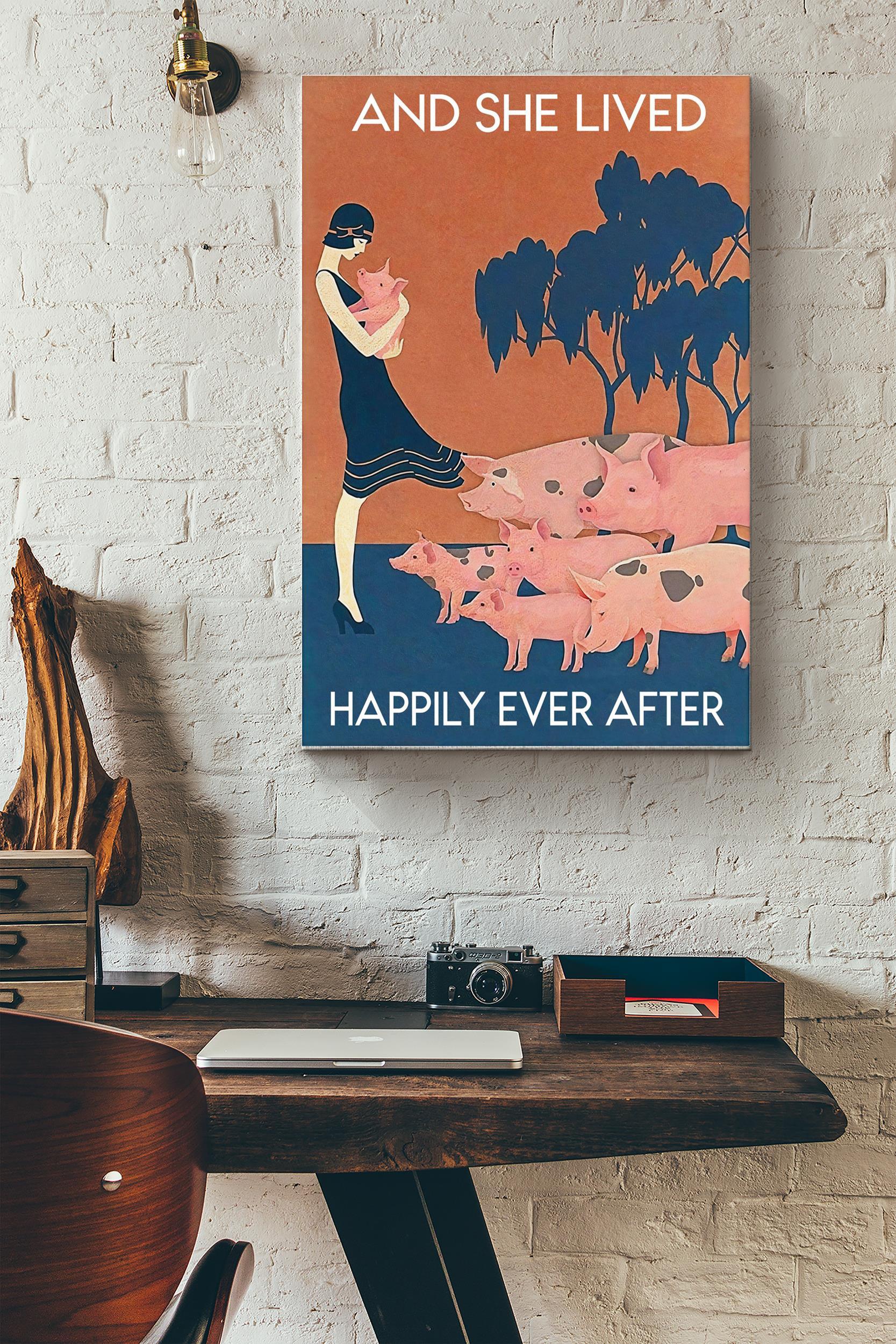 She Lived Happily Ever After Vintage Poster – Decor Wall Art – Gift For Pig Lover Farmer Farm Girl Wrapped Canvas
