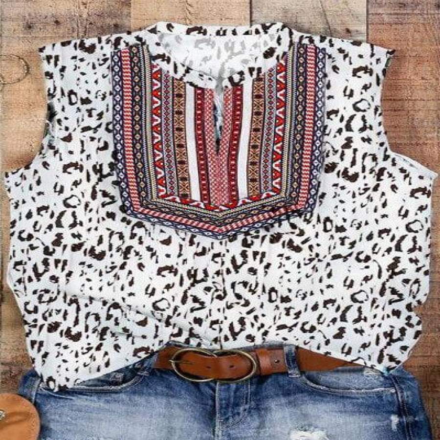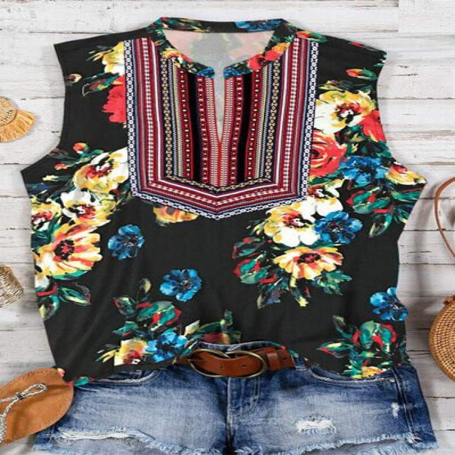 Vintage Flower Print Pleats V-Neck Tank Tops